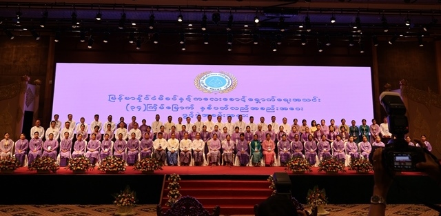 မြန်မာနိုင်ငံမိခင်နှင့်ကလေးစောင့်ရှောက်ရေးအသင်း ၏ (၃၄)ကြိမ်မြောက် နှစ်ပတ်လည် အစည်းအဝေး ဖွင့်ပွဲအခမ်းအနားကို ၂၀၂၅ခုနှစ်၊ အောက်တိုဘာလ (၉)ရက်နေ့၊ နံနက် (၉:၀၀)နာရီ အချိန်တွင် မြန်မာကွန်ဗန်းရှင်းစင်တာ MICC-I ၊နေပြည်တော်၌ ကျင်းပပြုလုပ်ရာ ပြည်ထောင်စု သမ္မတမြန်မာနိုင်ငံတော်၊ ယာယီသမ္မတ၊ တပ်မတော်ကာကွယ်ရေးဦးစီးချုပ် ၏ ဇနီး၊ မြန်မာနိုင်ငံ မိခင်နှင့်ကလေးစောင့်ရှောက်ရေးအသင်း၏ ဂုဏ်ထူးဆောင်နာယ ဒေါ်ကြူကြူလှ တက်ရောက် ချီးမြှင့်ခဲ့ပါသည်။